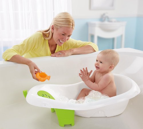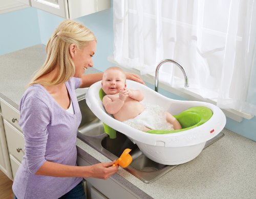 Fisher-Price 4-in-1 Sling 'n Seat Tub: Four-stage bath center now features ???Sit-Me-Up Support??? to aid unsteady sitters in the tub. From newborn to infant to toddler, this tub adapts to Mom's and baby's changing needs at every stage! Stage 1 soft mesh sling gently cradles newborns in just the right amount of water, giving little ones a sense of security. As baby grows, the tub ???grows,??? too! Just remove the newborn sling and add the Stage 2 ???baby stopper??? insert. It puts infants at a gentle recline on a soft-foam surface, preventing slipping and sliding, and making bath time less stressful. When baby is ready to sit up & play, the baby stopper insert converts to a unique Stage 3 Sit-Me-Up Support that helps unsteady sitters to sit comfortably and allows parents full access for washing. And when baby grows to Stage 4 Toddler, the Sit-Me-Up Support easily removes to reveal a roomy tub that's just the right size.