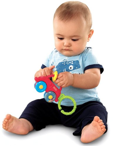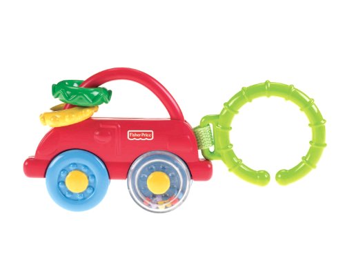An adorable car teether for your baby boy;Two colorful clacker rings for baby to shake;Beads in one wheel for baby to rattle;Teethable surfaces helps baby soothe sore gums;Links onto a stroller for on-the-go fun