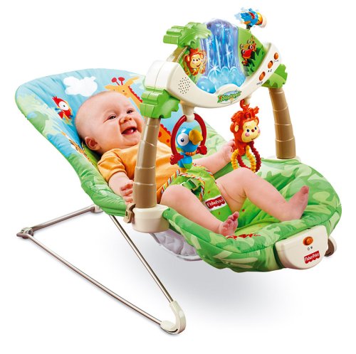 A tree frog and a monkey play peek-a-boo in the leaves near a sparkling waterfall. A toucan moves back & forth overhead. All the wonders of the rainforest are captured for your little one in this amazing bouncer. Baby bats at the hanging toys to activate the light-up waterfall and peek-a-boo action, accompanied by rainforest songs & sounds. Or, Mum can activate for continuous play! After a day of rainforest adventure, turn on the calming vibrations and your little one is ready to relax!Requires 4 "D" alkaline batteries (not included). Weight Limit: 25 lbs. (11.3 kg)Developmental Guidelines: Use from birth until the child is able to sit upright unassisted.Better for Baby...- Promotes comfort & security- Calming vibrations and gentle bouncing motion comforts and soothes baby.- Encourages developing motor skillsReaching, batting at, and grasping onto colourful animals fosters eye-hand coordination.- Stimulates sensesWaterfall with lights and colourful animals stimulates baby's visual sense.Rainforest sound effects and variety of songs offer baby auditory stimulation.- Enhances learning through discoveryPromotes understanding of cause & effect as baby bats at hanging animals to activate the lights and sounds.Better for Mum...- Removable toy bar-easier to get baby in and out.- Long play music mode allows mum some "hands free" time.