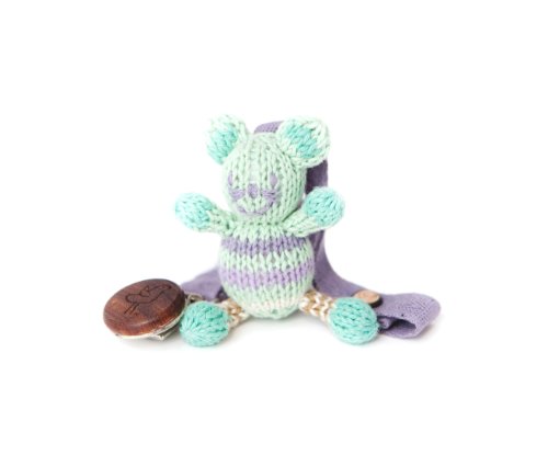 ストラップの真ん中についているオーガニックコットンの編みぐるみがアクセントになってとても可愛いです