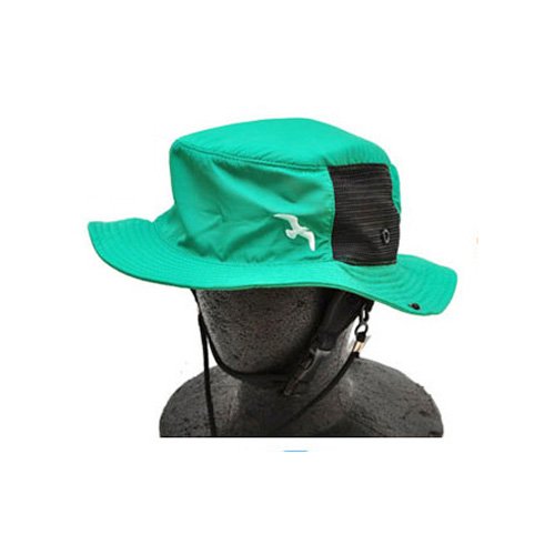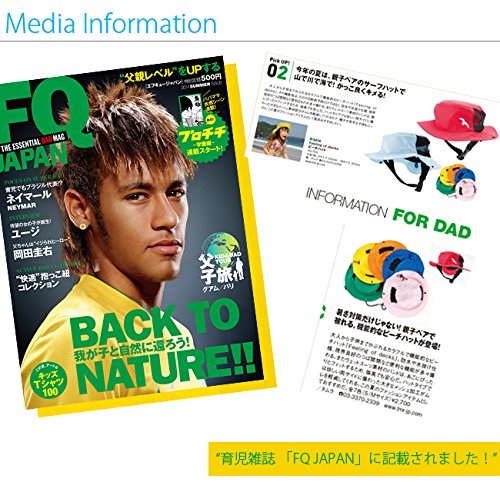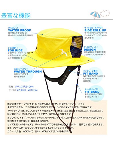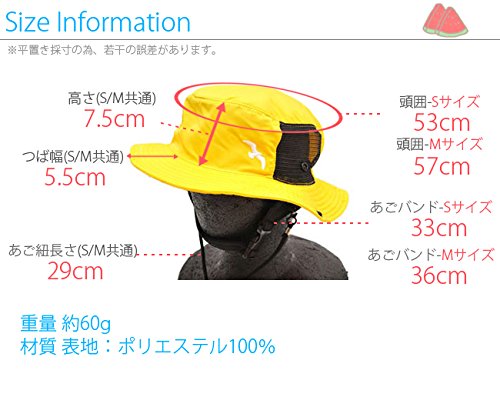 Sサイズ、Mサイズで親子ペアルックでかぶれるサーフ・ビーチハットです☆育児雑誌「FQ JAPAN」で紹介されました! 撥水加工で水をはじく!吸水しないから軽量感が持続します。 ツバの上げ下げが自由自在。テイクオフ〜ランディング時に視界を妨げません。大きなメッシュで水抜け抜群。日本人の頭部を考慮して作られています。WET素材のフィットバンドがアゴにぴったりフィットして風の強いコンディションでも飛ばされず安心です。フィットバンドは収納が可能です。海上がりはループ紐ですっきりフィット。 【サイズ】Sサイズ:53cm、Mサイズ:57cm 【重量】約60g 【素材】表地:ポリエステル100%