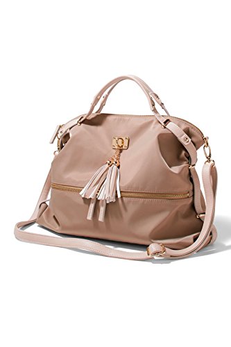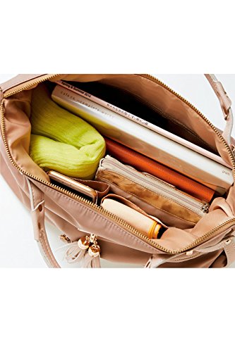 持ち方いろいろ3-WAY。大人仕様のレディーなバッグ。 軽くて使いやすいナイロン素材ながら、高級感あるディテールとピンクベージュが旬色で大人っぽい。シーンに合わせて肩掛け、リュック、手持ちにと3-WAYで使い分けできる機能的なデザイン。ゴールド金具とタッセルが上品なポイントで、通勤などきれいめコーデにもぴったりです。