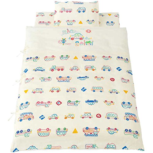 「フジキ Wガーゼ携帯布団7点セット くるまパークプラス(クリーム)」は、保育園、幼稚園などのお昼ね布団、帰省時や旅行時のお昼寝に最適です。手さげバッグ付で持ち運びに便利です。汗っかきのお子様にぴったりの吸水性、発散性に優れたガーゼ生地使用の布団セットです。安心の日本製♪ ★敷き布団は、厚さ3cmの固綿を使用しておりますので、床の硬い場所に敷かれても安心です。 ★別売りで同柄のガーゼケットがありますので暑い時期も最適です。 ★掛けカバー、敷きカバー、手さげバッグは3ヶ所を紐で結ぶタイプです。