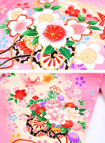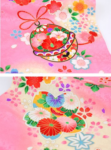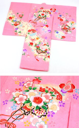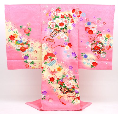 一生に一度の大切なお宮参り用のお着物です。女の子らしいピンク色にクリーム色のぼかしがはいっており、御所車や鈴に鶴などお祝いにピッタリな柄行となっております。金彩であしらわれた刺繍が豪華さをあらわしております。七五三の時にはみあげして頂いて着て頂けます。