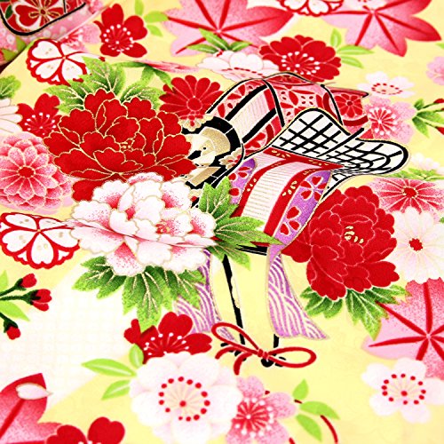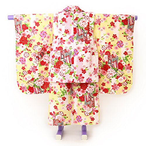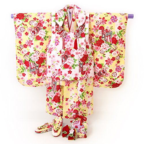「【63】黄色地に御所車と鼓/被布:白」七五三 着物 3歳 被布着物7点セット