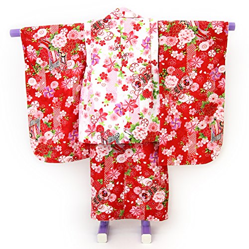 「【60】赤地に御所車と鼓/被布:白」七五三 着物 3歳 被布着物7点セット