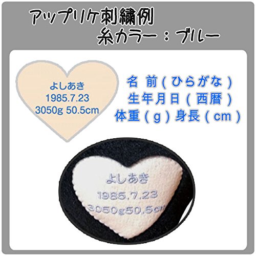 - 刺繍糸カラーはブルーにて刺繍します。 ハートアップリケの刺繍内容はご注文後にメールにてご連絡ください。 例:「よしあき/1985.7.23/3050g/50.5cm」