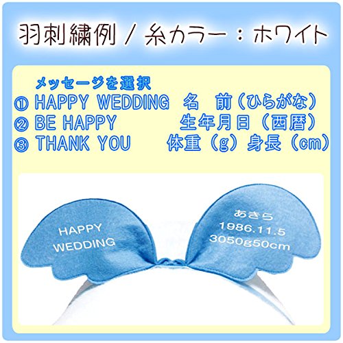 - 刺繍糸カラーはホワイトにて刺繍します。 羽の刺繍内容はご注文後にメールにてご連絡ください。 例:「HAPPY WEDDING」 例:「あきら/1986.11.5/3050g/50cm」