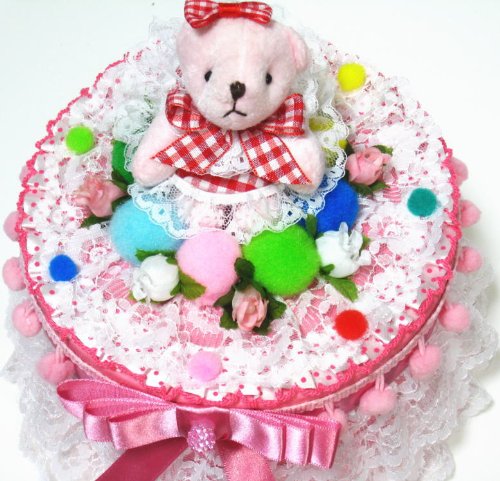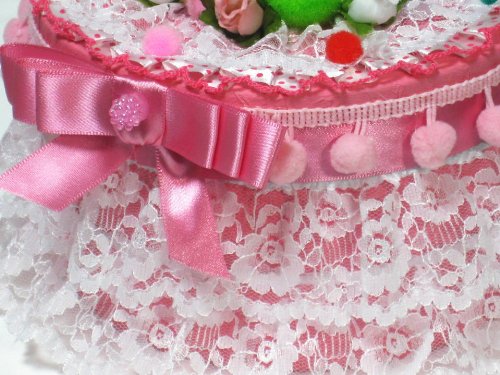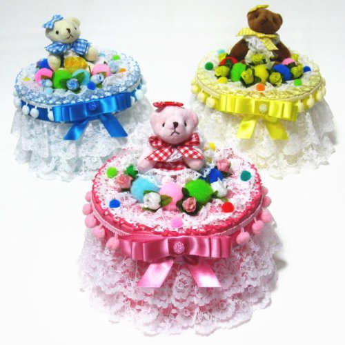 - レースやお花をふんだんに、カラフルなパーツ等で可愛く豪華に仕上げた、1段の丸形おむつケーキ/ボックスタイプ 3色からお選びいただけます