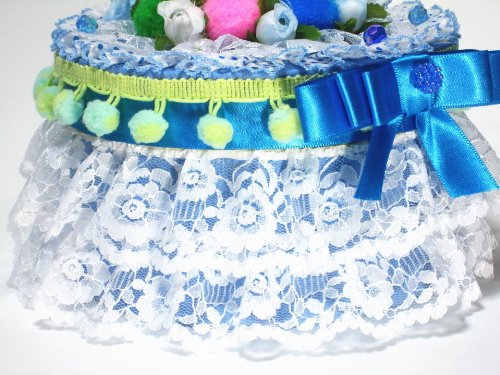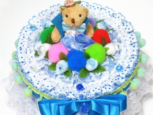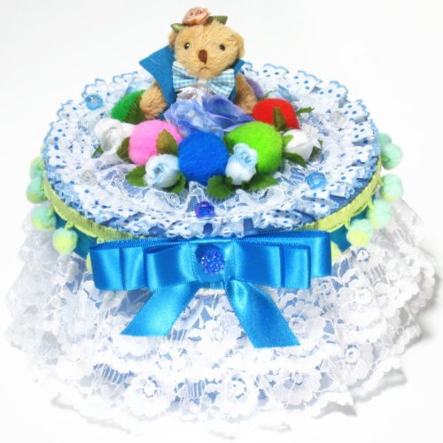 - レースやお花をふんだんに、カラフルなパーツ等で可愛く豪華に仕上げた、1段丸形のおむつケーキ/ボックスタイプ 6色からお選びいただけます