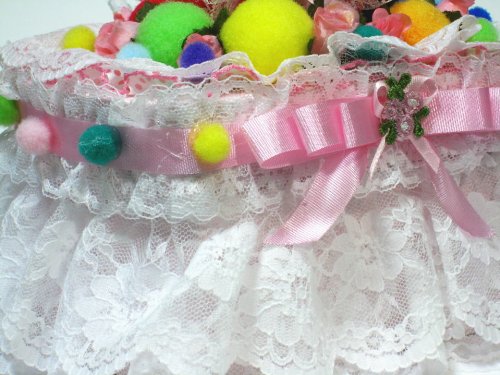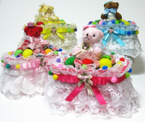 - レースやお花をふんだんに、カラフルなパーツ等で可愛く豪華に仕上げた、1段の角丸形おむつケーキ/ボックスタイプ 4色からお選びください