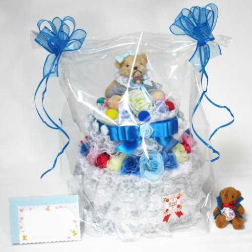 白いレースやお花をデコレーションした2段のおむつケーキ/ボックスタイプ (ブルー)