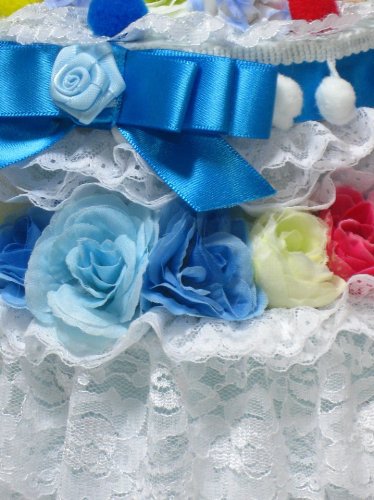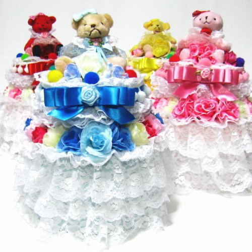 - レースやお花をふんだんに、カラフルなパーツ等で可愛く豪華に仕上げた、2段のおむつケーキ/ボックスタイプ 4色からお選びください