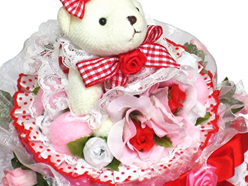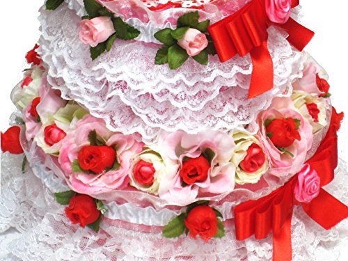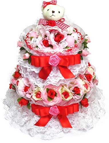 白いレース、お花等をふんだんに飾したカラフルな円形の2段おむつケーキ/109ボックスタイプ (レッド)【ノーブランド品】