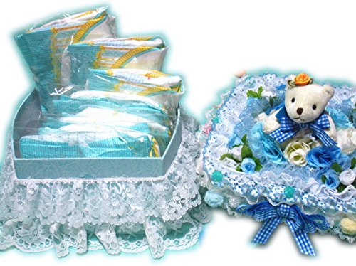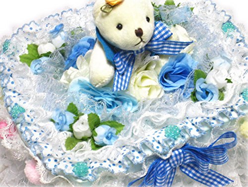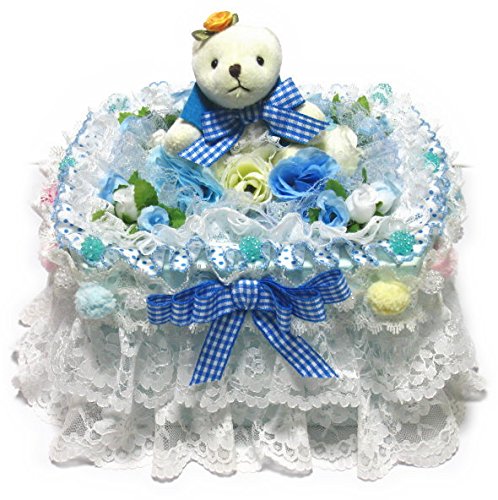 ギンガムリボン、白いレース、お花等を飾したカラフルなくまさんの角円形おむつケーキ/ボックスタイプ (ブルー)【ノーブランド品】
