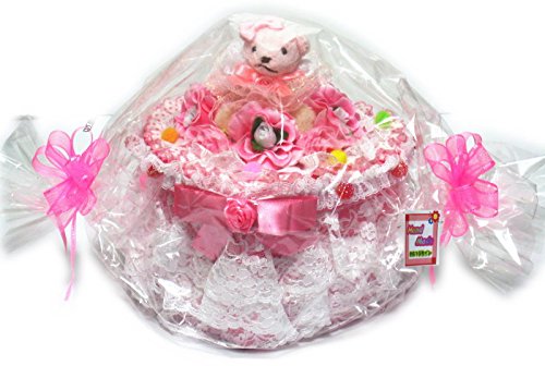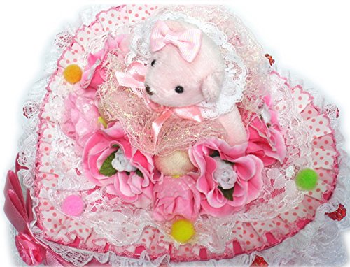 - 白い3層レースやお花をふんだんに、お洋服を着たくまさんが乗った可愛くも豪華な、1段ハート形のピンクおむつケーキ/ボックスタイプ