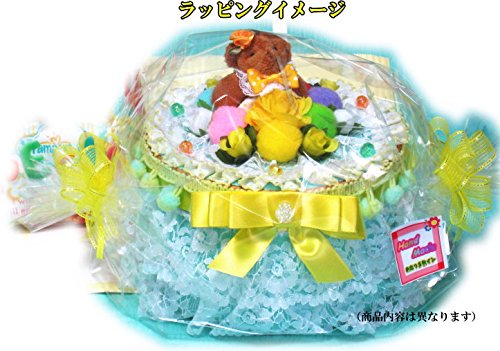- 白い3層レースやお花をふんだんに、お洋服を着たくまさんが乗った可愛くおしゃれな1段ハート形のイエローおむつケーキ/ボックスタイプ