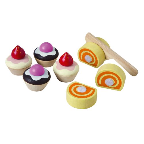 トッピング付きカップケーキ2種類が各2個、 ロールケーキとナイフのセットです。 カップケーキはトッピングを変えることができます。 ロールケーキは4つに切り分けることができます。 ●ヨーロッパの安全基準CEをクリアしています。 ●なめても安全な塗料を使用しています。 ☆発送日ご連絡を差し上げます。