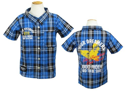 RUSK バックプリント 半袖チェックシャツ【3221-10】 (110cm, ブルー)