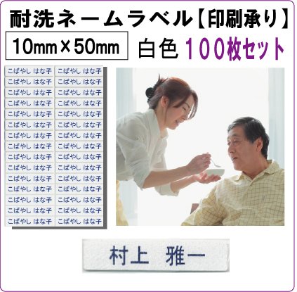 20mm×50mmサイズのご注文の名前を印刷した白色ラベルが100枚ついた洗濯に強いアイロン・ネームラベルです。老人ホームや介護施設で入所の際に義務付けが多い下着などの衣類の名前付けにぴったりのネームラベル。お名前を印刷してお届けいたします!!家庭用アイロンで付けられて、洗濯機でがんがん洗っても安心の耐洗ネームラベルです。もちろん保育所に赤ちゃんやお子様の預ける際の衣類の名前つけにも最適です。印刷するお名前は、ギフト欄に入力ください。忘れてしまった場合はメールでお知らせください。文字数はひがらなで10文字、漢字で6文字程度です。印刷する名前が不明の場合は作成できませんのでご注意ください。