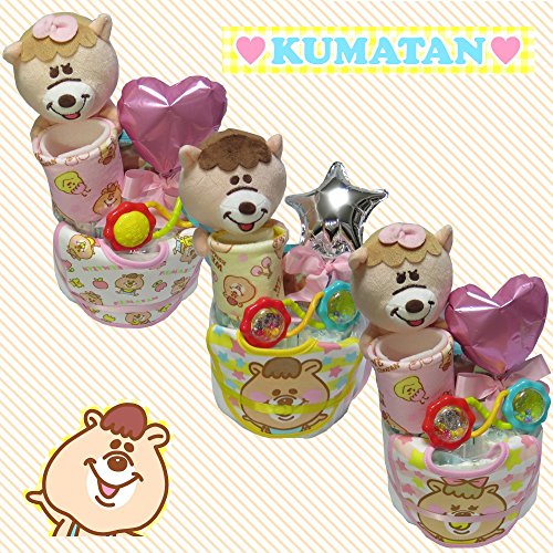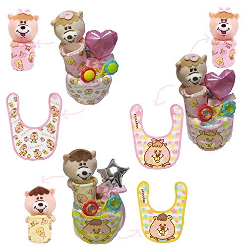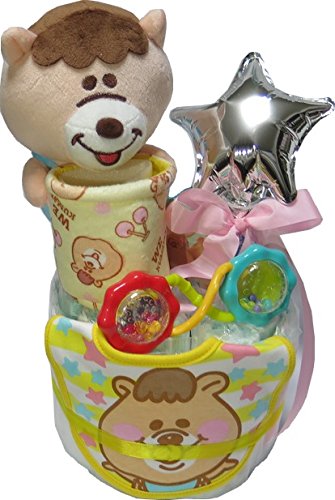 【出産祝い・おむつケーキ】おむつ・おしりふきケーキ WC くまたんビブスタイ ぬいぐるみマスコットバスケットポケット ブライトスターツラトル (イエロー くまたん)