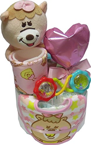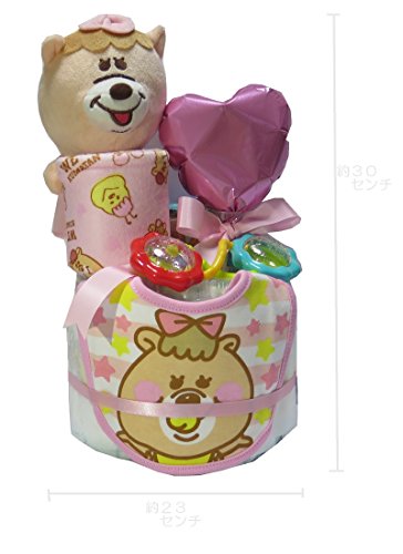 【出産祝い・おむつケーキ】おむつ・おしりふきケーキ WC くまたんビブスタイ ぬいぐるみマスコットバスケットポケット ブライトスターツラトル (ぴんく くまたんの彼女)