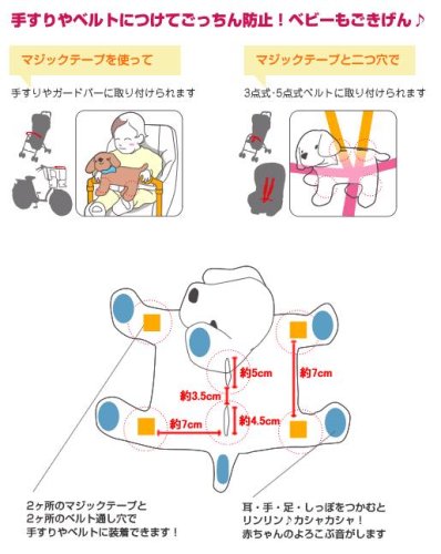「ベッタ おでかけクッション!Take me!トイプードル(ナッツ)」は、ごっちん防止もできるおでかけクッションです。面ファスナーとベルト通し穴で手すりやベルトに装着。耳・手・足・しっぽをつかむと、キュッキュッ、リンリン、カシャカシャと赤ちゃんの喜ぶ音がします。 製品仕様 材質