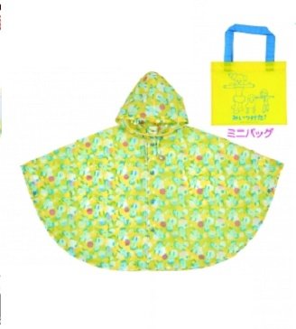 雨の日が楽しくなる、カラフルなコッシー柄のポンチョです。 つばは透明になっているので前が見えて安全です。 たたんでしまえるミニバッグが付いています。