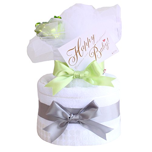 ベビーアルテ 今治 バスタオル付き 2段 おむつケーキ 【おむつ:パンパースSサイズ】グリーン×グレイ