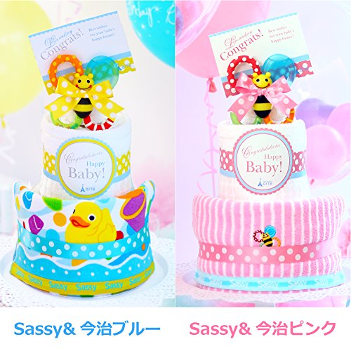 - 大人気サッシーおもちゃ付おむつケーキ。肌触りのいい今治のウォッシュタオルと楽しい柄のSassyフェイスタオルの2枚ついて大好評♪おもちゃもSassyなので安心! 出産祝いやお誕生日プレゼントにオススメです★