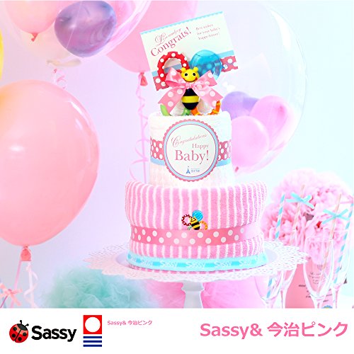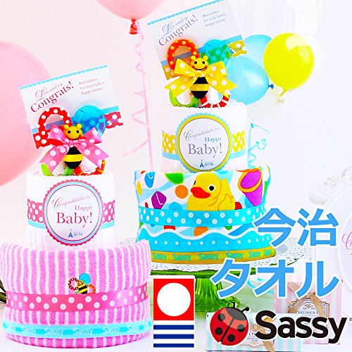 大人気サッシーおもちゃ付おむつケーキ。肌触りのいい今治のウォッシュタオルと楽しい柄のSassyフェイスタオルの2枚ついて大好評♪おもちゃもSassyなので安心!出産祝いやお誕生日プレゼントにオススメです★ご希望のメッセージをお入れできます。ご希望のお客様はメッセージ欄にご記入ください。