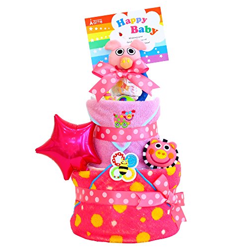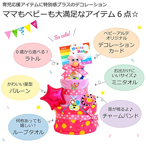おむつケーキ Sassy ( サッシー) ポップスター 3段 おむつケーキ タオル付 おもちゃ付 男の子 女の子 【おむつ種類:パンパース】 (おむつサイズ:M, ブタさんピンク)