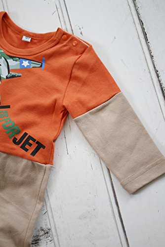 元気なオレンジに、男の子の大好きなひこうきがプリントされたカバーオール。