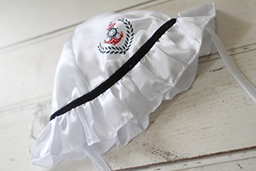- かわいいセーラーの女の子のセットアップとフリルの帽子のセットです。上下セットアップのように見えて実は一体型のワンピースタイプなので、着用も1回ですみます。襟元前の部分にスナップがあり、着脱しやすいようになっています。