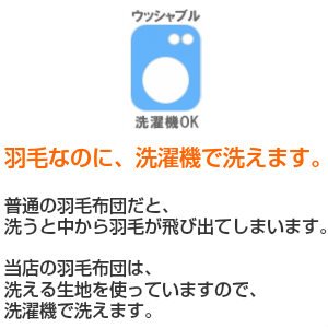 - 羽毛なのに洗濯機で洗えます。通常は陰干しで湿気をとばしてください。特に汚れた場合は、洗濯機で丸洗いできます。