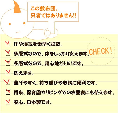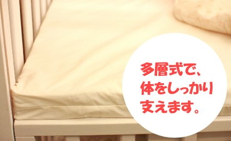 ベビー用の敷布団。一般的なベビーベッド(70x120cm)対応サイズです。いつもさらさらで不快な蒸れ感がありません。特殊多層式のわたがしっかりと赤ちゃんを支えるので、ぐっすり眠れます。厚さ5cmですが、大人の体も眠れるほどの弾力があります。汚れた場合でも洗濯機で丸洗いできるので清潔に保てます。