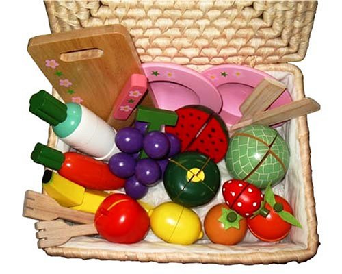 木製幼児向けままごと用品。果物、野菜など12種類の食べ物とお皿、まな板、包丁の調理器具などのセット。 ”食”のごっこ遊びは、食事について興味がわいたり、果物や野菜を切ったり調理することの楽しさを覚え、家族の役割分担を理解し、想像力を育む手助けをする。
