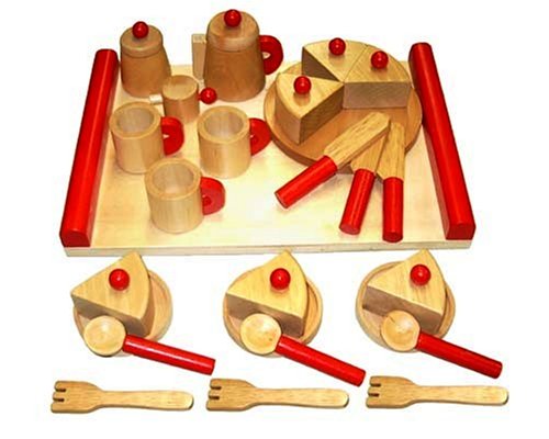 木製幼児向けままごと用品。 子どもはケーキのおもちゃや、お誕生日ごっこが大好き。トレイに乗せてケーキをお客様に運ぶというシチュエーションも楽しめる。 内容は、ケーキを丸ごと載せられる大きなお皿1枚、カップソーサーにもなる小分け用皿、カップ、スプーン、フォーク、ナイフはそれぞれ3人分、ティーポット、シュガーポット、ミルクソーサーのセット。