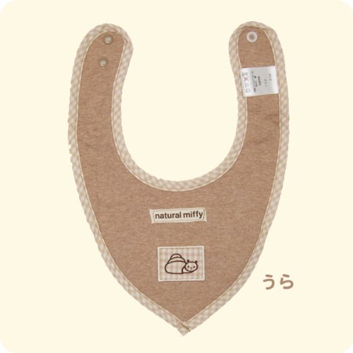 あたたかで優しい色合いのnatural miffyシリーズ。こちらはバンダナ風のデザインがおしゃれな、リバーシブルタイプのよだれかけです。スナップボタンで留めるタイプ。