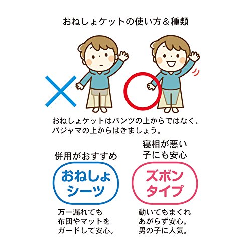 パイル素材に防水ラミネートシートを挟みこみ、はくだけでおねしょの外への浸み出しを防止するケット。寝相が悪くてもまくれ上がらず安心のズボンタイプです。下半身をくるむので、シーツはもちろん掛け布団側への浸み込み対策にも。おむつ卒業時やお泊まり時にも活躍します。※おねしょケットを着用する際はパンツの上からではなく、パジャマの上からはきましょう。