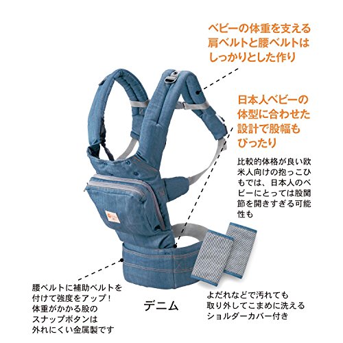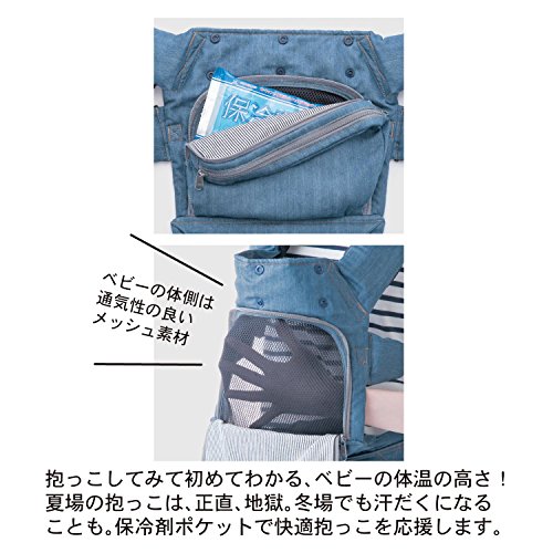 日本人ベビーの体型に合わせたやさしい設計と、幅広の肩ベルトと腰ベルトでママにもやさしい仕様。1人でも簡単にできるおんぶホルダーや、ベビーの頭をしっかりガードするスリーピングフードで、ママ1人でも安心。ポケットは開けるとメッシュ素材で、暑がりベビーも快適です。保冷(保温)剤も入れることができ、季節に合わせて使えます。腰ベルトを外さずコンパクトにまとめられて、使用しない時も邪魔になりません。汚れても取り外してこまめに洗えるショルダーカバー付きです。