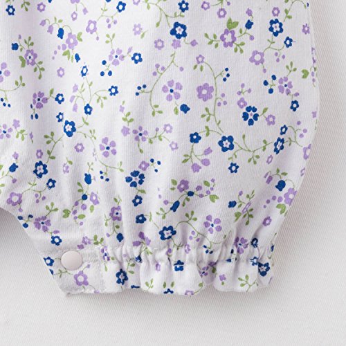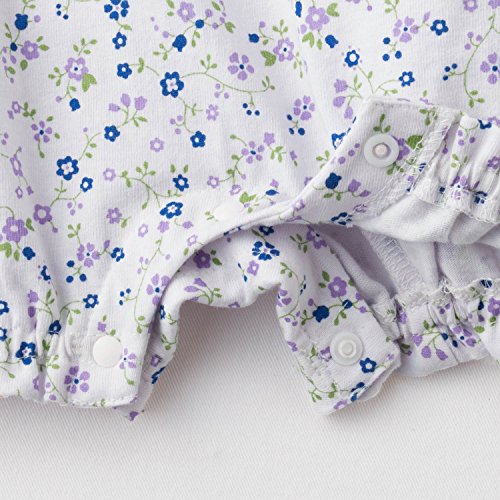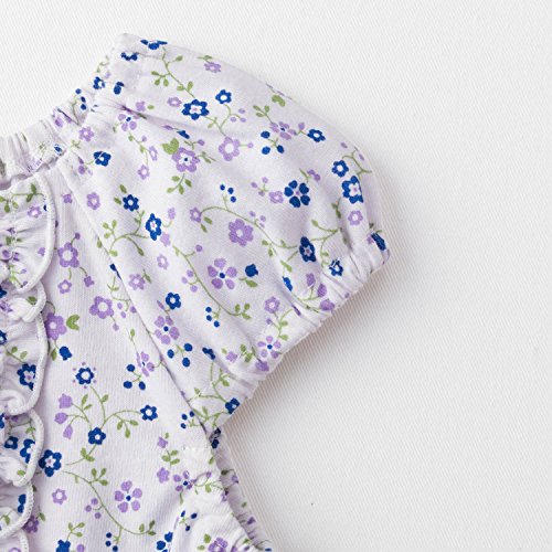 やさしい肌あたりの綿100%天竺素材で仕立てたショートオール。フレンチ袖やゴム入りの足口がふんわり愛らしいシルエットです。フロントフリルと上品な花柄が華やかで、そのままお出かけもOK。急なお客様にも慌てません。