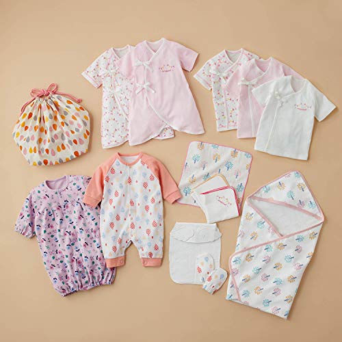 短肌着やコンビ肌着、アフガンなど、出産後すぐに活躍する肌着と小物をセットにしました。ママの気分も明るくなるカラフルなデザインで、柔らかな綿100%素材だからデリケートなベビーの肌にも安心です。贈り物にもおすすめ。男児用(別売)もあります。