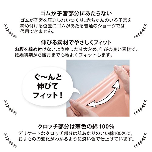 腹巻付きで脚口が目立たない1分丈 伸びのいいベア天竺素材で程よくフィット。脚口はアウターに段差がひびきにくい仕様です。ウエスト部分が子宮にあたらないつくりで、お腹の赤ちゃんにやさしいマタニティショーツ。ストレスフリーなはき心地です。クロッチ部分は薄色の綿100%。肌が敏感になるマタニティ期にやさしく、おりものの変化もわかりやすい仕様です。