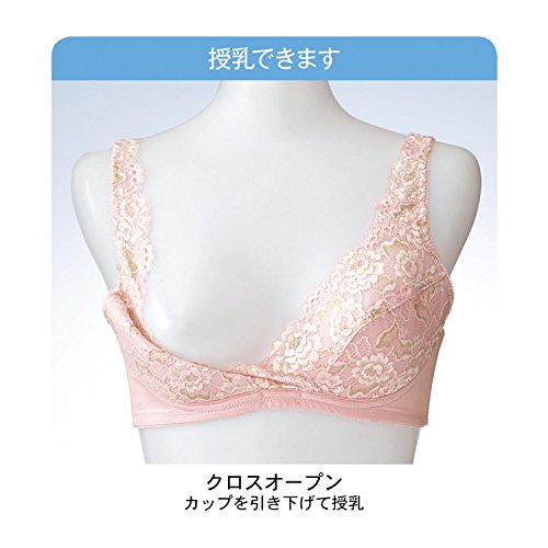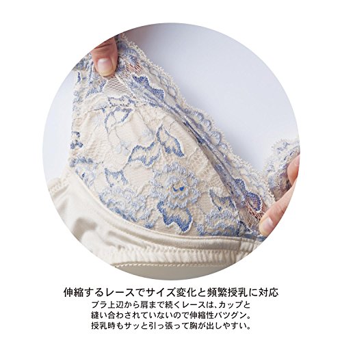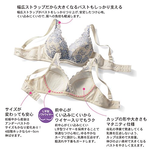 変化するバストをやさしく育てて、授乳もらくらく 妊娠から授乳期の変化するバストをやさしくサポート。発売以来先輩ママから愛され続け、今では支持率ナンバーワン!妊娠中でもきちんとバストをホールドしたい方や外出時に美しくバストメイクしたい方にオススメです。締めつけやくい込みを防いでくれるソフトなL字型ワイヤーで、ラクなつけ心地で美胸をキープしてくれます。乳腺の圧迫も緩和し、授乳期に重みを増すバストの下垂対策にも。カップ部分のレースは伸縮素材だから、サイズ変化に対応して心地よくフィット。幅広のストラップが肩にくい込みにくく、重くなるバストをしっかり支えてくれます。授乳機能付きで産後も長く活躍。クロスオープンタイプで片手でサッと簡単に授乳できます。初めてのマタニティブラジャーにもおすすめです。