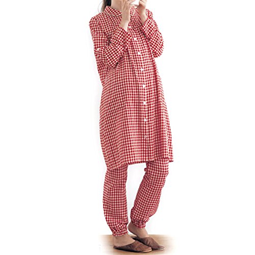 【春夏向け・綿100%・入院準備に】授乳対応マタニティ長袖ロング丈パジャマ レッド系チェック柄 サイズ:マタニティS
