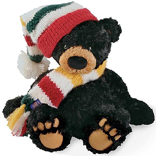同じストライプ柄の帽子とマフラーをしたかわいいテディベアのぬいぐるみです。