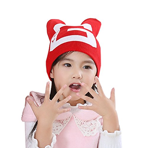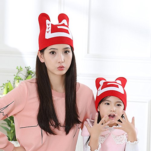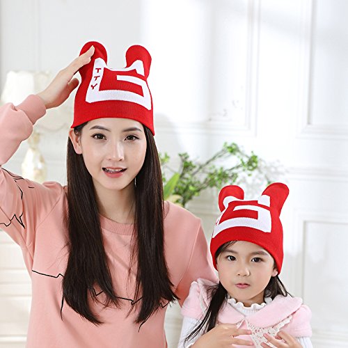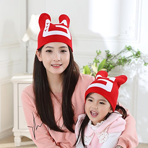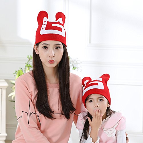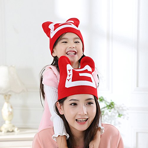 親子キャップ ママ&ベビー 暖かい ニットホーン帽子 可愛い 写真の小道具 (子供, 赤)