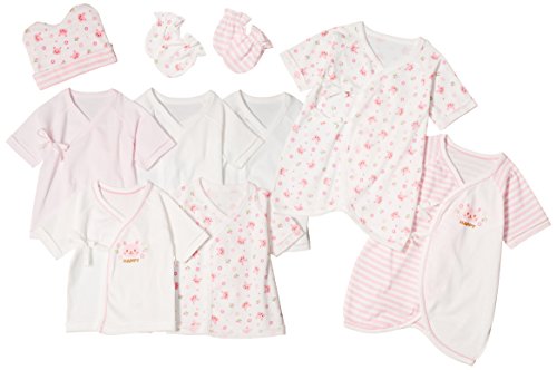 内容は短肌着5枚(白無地2枚、カラー無地1枚、ワンポイント柄1枚、総柄1枚)、コンビ肌着2枚(ワンポイント柄1枚、総柄1枚)、ミトン2組、帽子1個の10点入りです。 伸縮性がありやわらかいフライス素材(綿100%)で作っています。 かわいいウサギ&花柄とボーダーで肌着と小物(ミトン、帽子)がコーディネイトできる男の子にも女の子にもおすすめのセットです。 帽子はリバーシブルでご使用いただけます。 <セット内容>短肌着5枚(白無地3枚、ワンポイント柄1枚、総柄1枚)、コンビ肌着2枚(ワンポイント柄1枚、総柄1枚)、ミトン2組、帽子1個 <主な素材>綿 <品質表示>洗濯機可、タンブラー乾燥不可