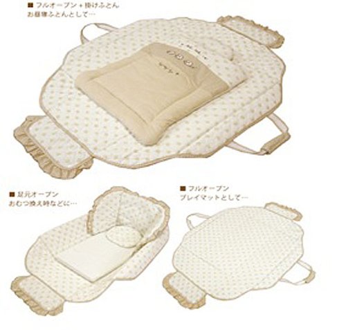- クーハン本体 (マット・バッグ兼用)、掛けふとん(綿入り/内側:パイル生地使用)、ヘッドガードS(側生地:先染め)、ドーナツ形状枕(側生地:パイル素材)、コンパクト敷きふとん(カバー付)
